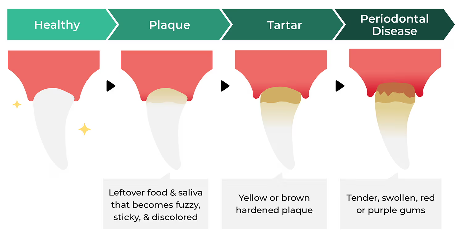 Dental plaque forms when food particles and bacteria accumulate on teeth, leading to inflammation and redness of the gums. If it isn’t removed, plaque can progress to tartar buildup, a hard, yellowish substance that sticks to the teeth and harbors bacteria. This buildup doesn’t just result in stinky dog breath but also causes irritation and inflammation of the gums that can lead to pain and, eventually, tooth loss.