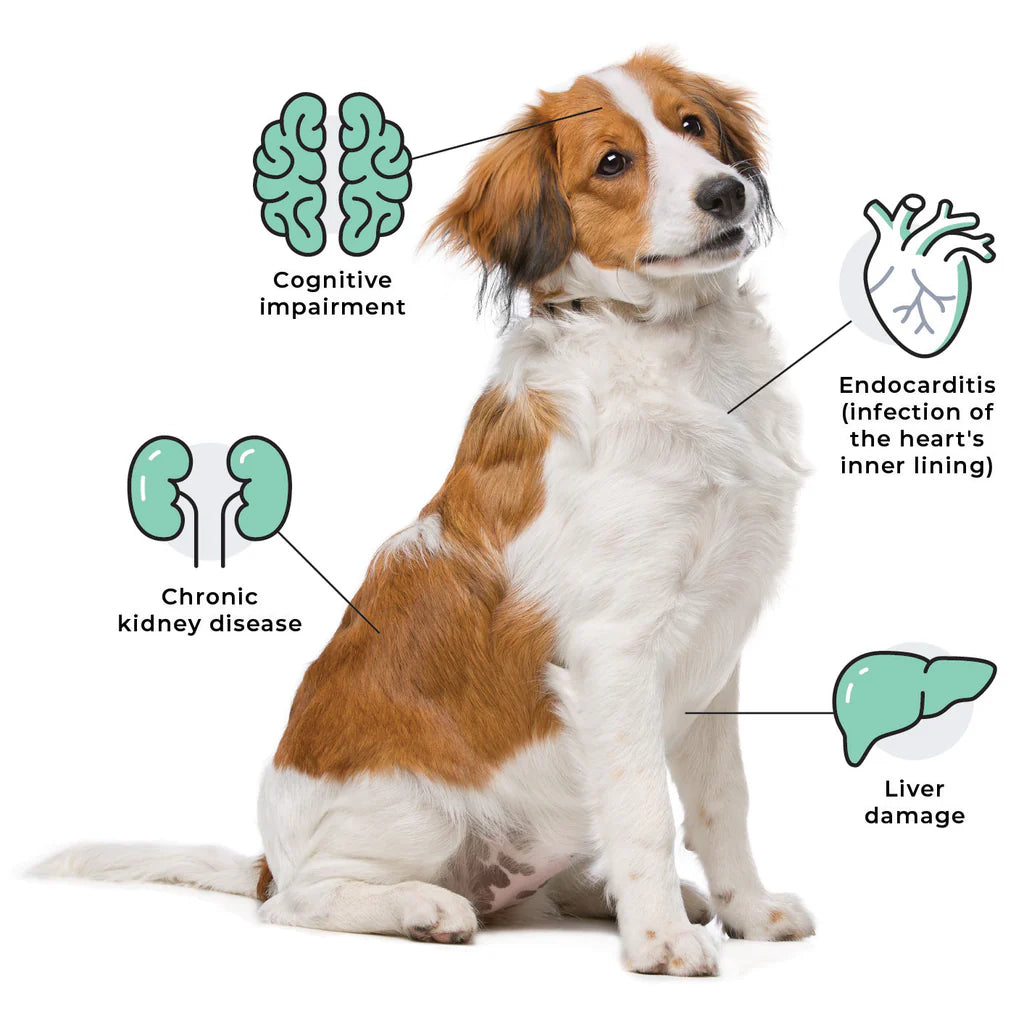 The long-term effects of these dental issues are far-reaching. Bad breath in dogs usually means there are underlying problems that need to be addressed, including infections and disease. Left untreated, gum inflammation can turn into periodontal disease, affecting not only oral health but potentially the heart, liver, and kidneys as bacteria spreads.