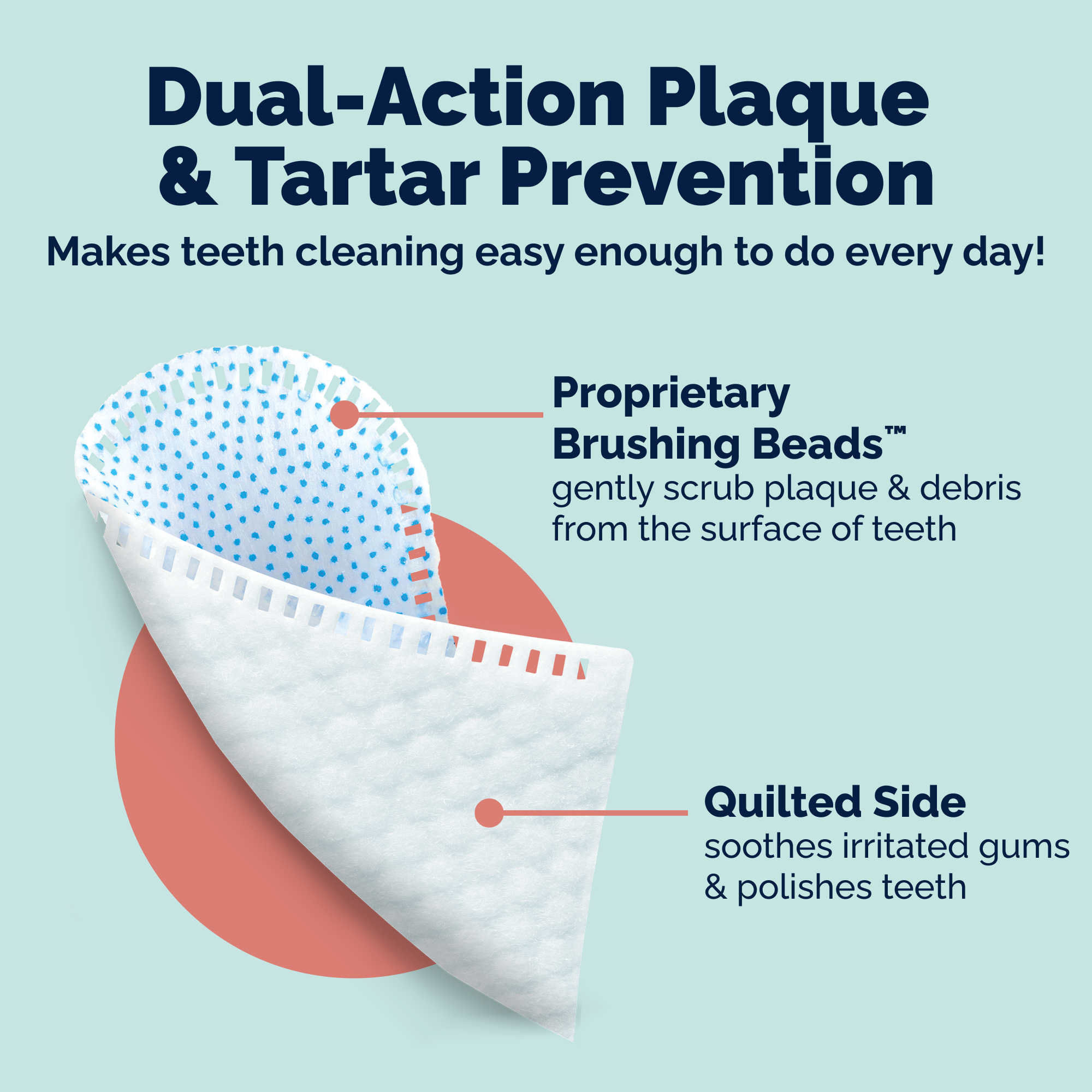 Our dog dental wipes have a dual-sided design that makes pet teeth cleaning easier than brushing with a traditional toothbrush. Natural ingredients like Rosemary Oil, Grapefruit Seed Extract, and Neem Oil target the causes of bad breath. One side of the mitt has bumpy Brushing Beads™ to buff away stubborn plaque and tartar, while the smooth side polishes teeth for a brighter smile.
