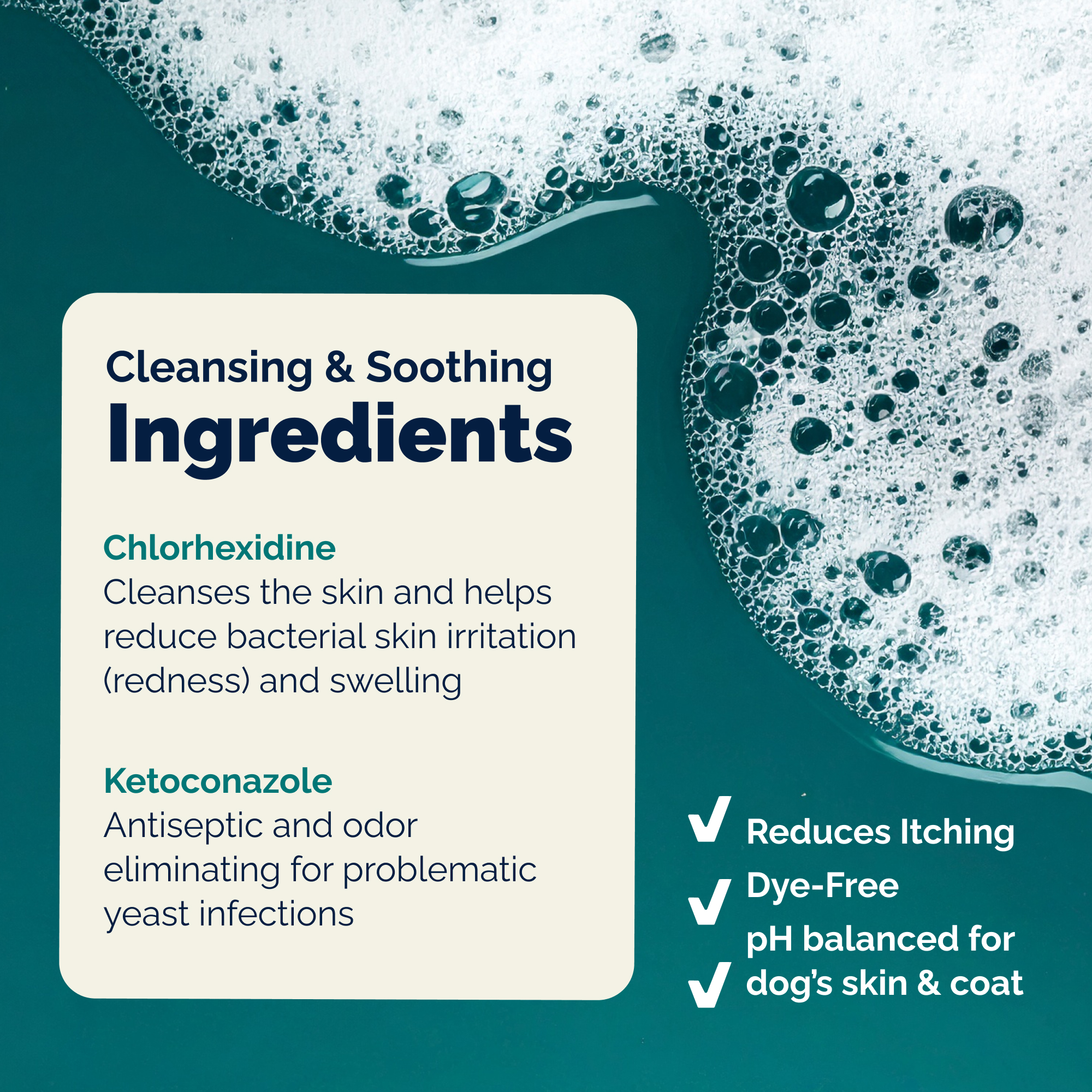 Dermabliss™ Anti-Bacterial & Anti-Fungal Shampoo is veterinarian formulated to treat skin conditions like bacterial, yeast, and fungal infections during bathtime. Our cleansing and deodorizing shampoo for dogs and cats treats infections while promoting healthy skin with a soothing, Ph-balanced formula. Dermabliss Anti-Bacterial & Anti-Fungal Shampoo is a soap-free, medicated shampoo with Chlorhexidine Gluconate and Ketoconazole for the treatment of bacterial and fungal skin conditions. This anti-septic formula produces a rich lather, rinses without residue, and leaves your pet's skin and coat clean and smelling fresh!