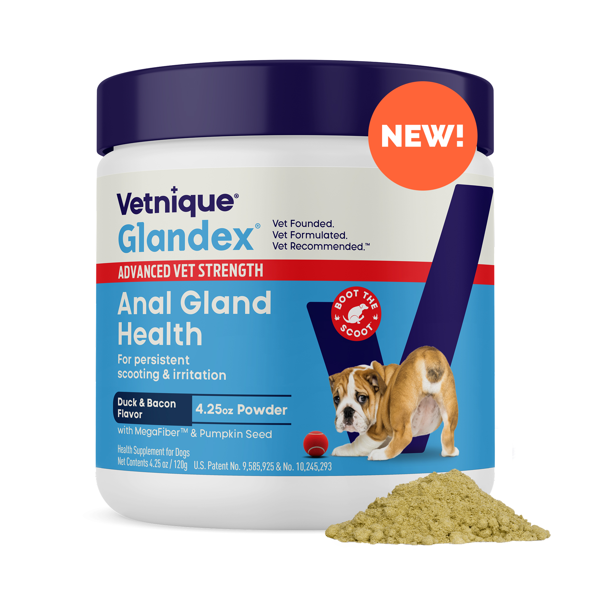 Glandex Advanced Vet Strength Anal Gland Health Soft Powder is veterinarian formulated to support natural emptying of your dog’s anal glands while supporting overall digestive health! Our patented formula offers higher levels of key ingredients like Fiber, Probiotics, a Prebiotic, and Digestive Enzymes for dogs who need an advanced level of support for persistent anal gland irritation like scooting, swelling, and more. These vet-strength anal gland supplements are available in tasty Duck & Bacon powder or soft chews to suit your pet’s preference.