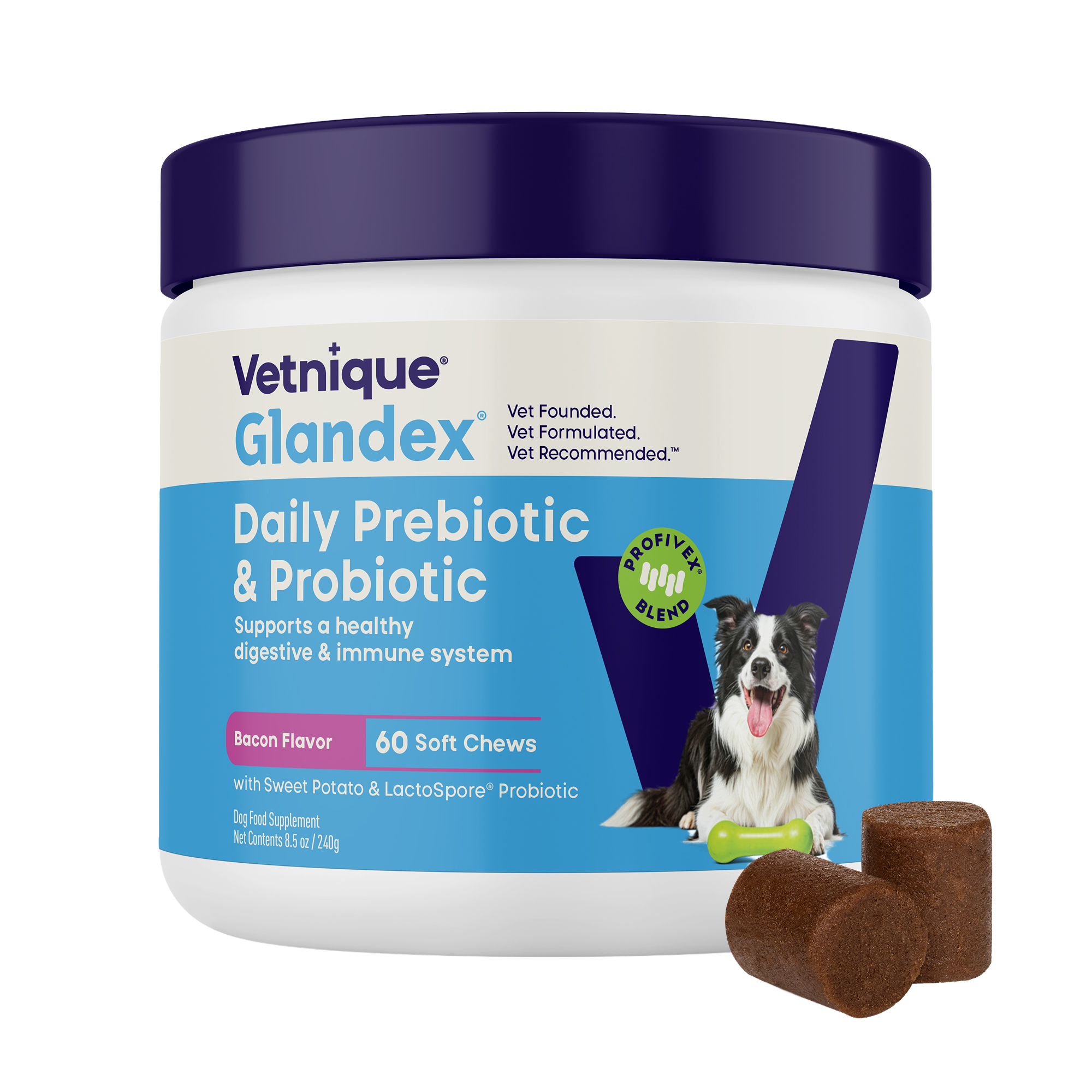 Glandex® Daily Prebiotic & Probiotic Soft Chews and Powder for Dogs are veterinarian formulated with our classic Profivex® blend of five, high-quality probiotic strains, a dual-prebiotic blend, a digestive enzyme, and added dietary fiber to promote a balanced gut and immune health every day. Made with key natural ingredients, these probiotic supplements offer a daily way to introduce and nourish bacteria in your dog’s gut microbiome, supporting better digestion, healthy stools, and immune health. Promote your dog’s daily well-being with vet-formulated digestive support!