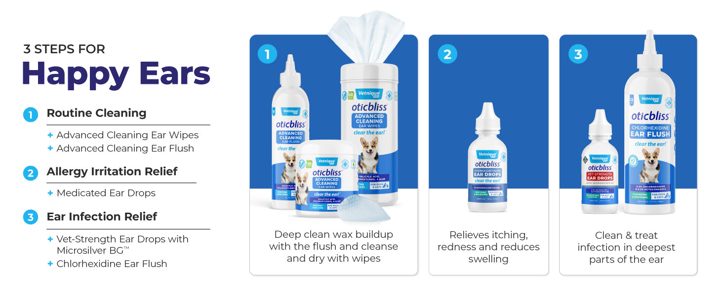 Oticbliss™ Anti-Bacterial & Anti-Fungal Medicated Dog Ear Flush was created by veterinarians to make dog ear care and pet ear cleaning easier. This dog ear flush treats ear infections while simultaneously soothing and deodorizing the affected area to provide relief to your pet. Our cat and dog ear flush cleaning solution is a cleansing, antiseptic ear flush containing Chlorhexidine Gluconate, Ketoconazole, and soothing Aloe Vera Leaf Juice. The medicated dog ear flush formula is tough on infections and gentle on ears to provide your pet relief from painful infections, reaching hard-to-reach areas to effectively clear the ear!™ Get help with dog ear cleaning today with a quality cat and dog ear flush from Vetnique.