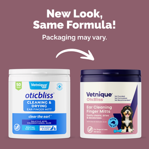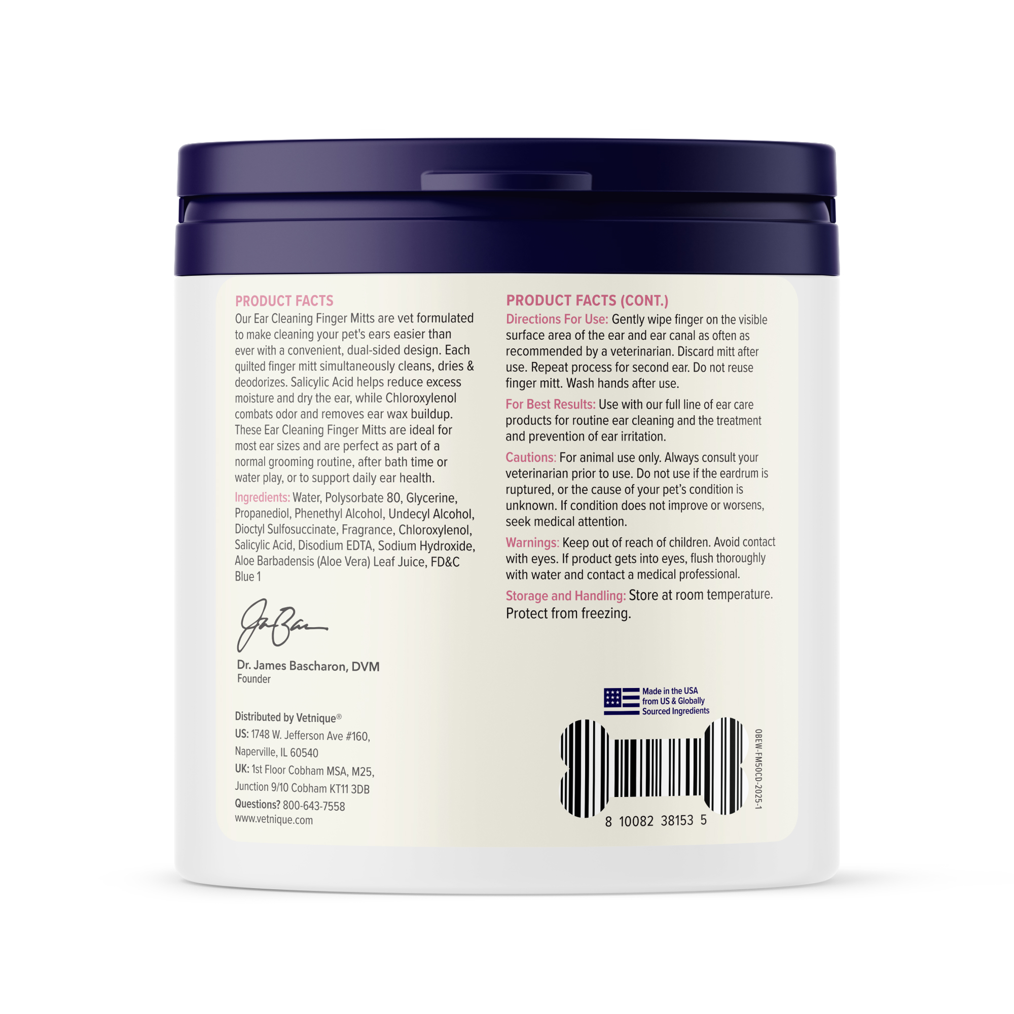 Oticbliss™ Cleaning & Drying Ear Finger Mitts are vet-formulated to make cleaning dogs' ears easier than ever with a convenient, dual-sided design. Each quilted wipe uses vet-recommended ingredients to clear the ear™ by cleaning, drying, and deodorizing. Salicylic Acid helps reduce excess moisture and dry the ear, while Chloroxylenol combats odor and removes cat and dog ear wax buildup. Cleaning & Drying Ear Finger Mitts are the ideal dog ear cleaning solution for most sizes of dog ears, and are perfect for cleaning dogs' ears as part of a normal grooming routine, after bath time or water play, or to support daily ear health.