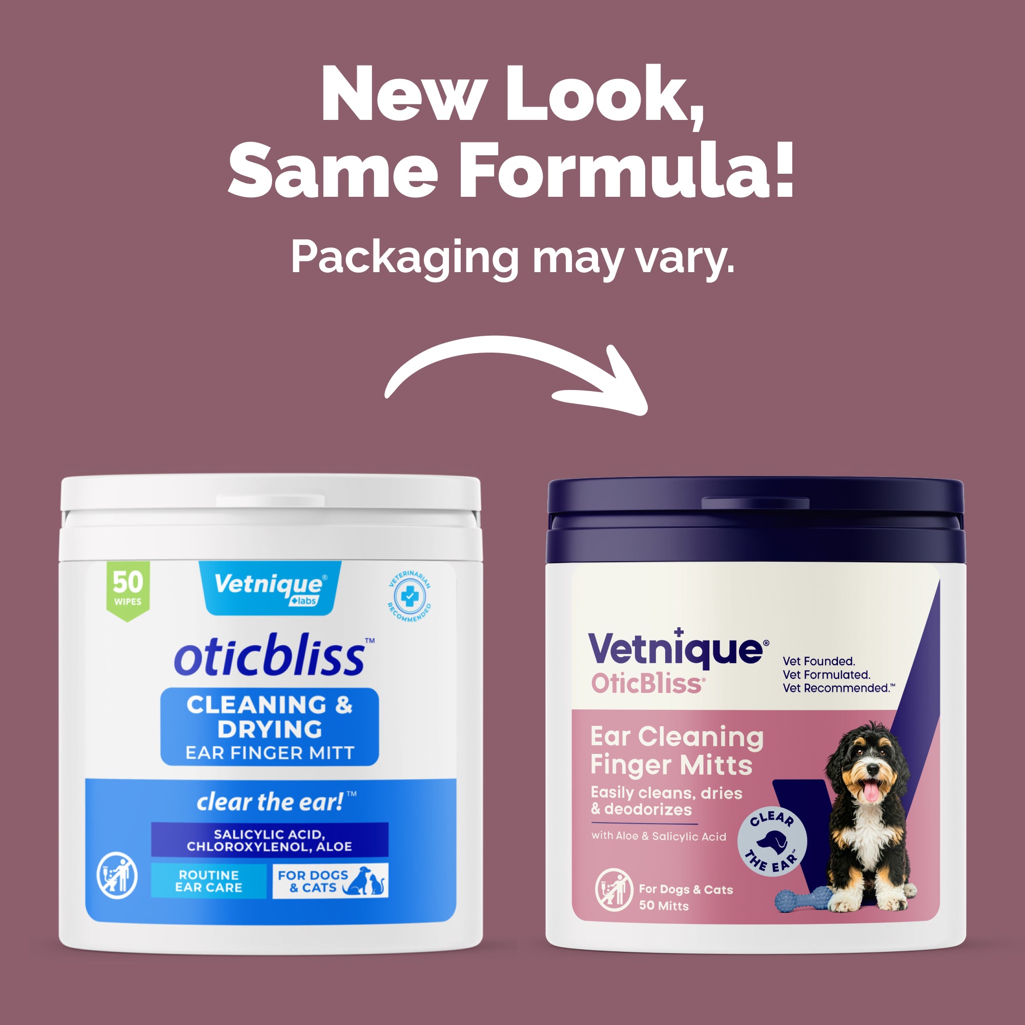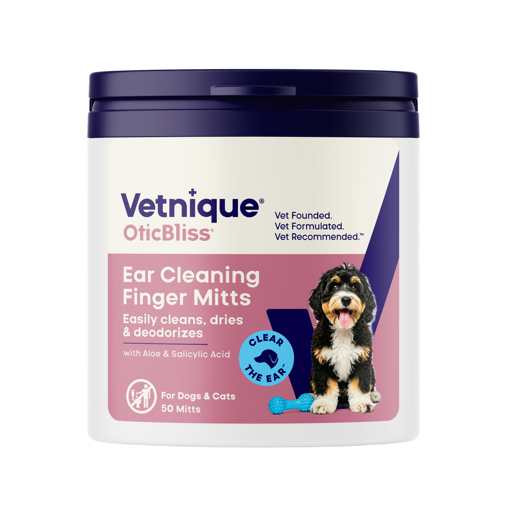 We have a variety of ear wipes to suit your dog’s ear anatomy (and options for cats, too). The Oticbliss Advanced Cleaning Ear Wipe is for extra-small ears. The Oticbliss Cleaning & Drying Ear Finger Mitt is suitable for most ears. The Advanced Cleaning XL Ear Wipe is for extra-large ears.
