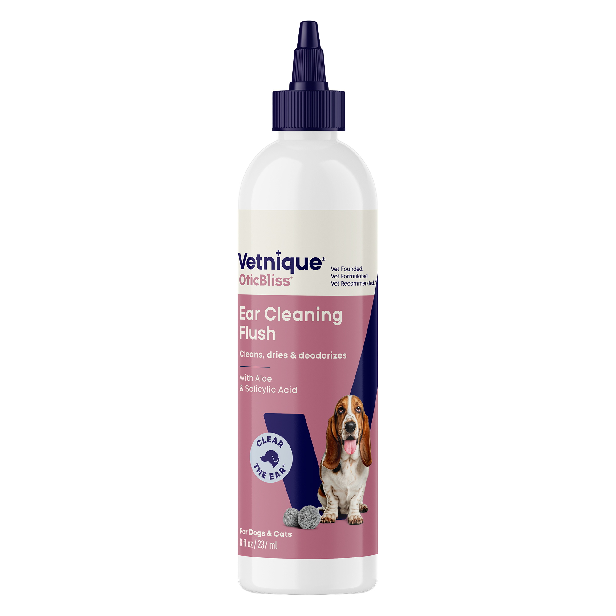 Oticbliss Advanced Cleaning Ear Flush was created by veterinarians to support healthy ears by gently removing dirt & wax. Our Oticbliss Ear Flush is a gentle but effective odor-destroying, cleansing, and drying ear flush. Containing Chloroxylenol for odor control, Salicylic Acid for drying, Docusate Sodium for the softening of ear wax, soothing Aloe Vera Leaf Juice, and nourishing Vitamin E.