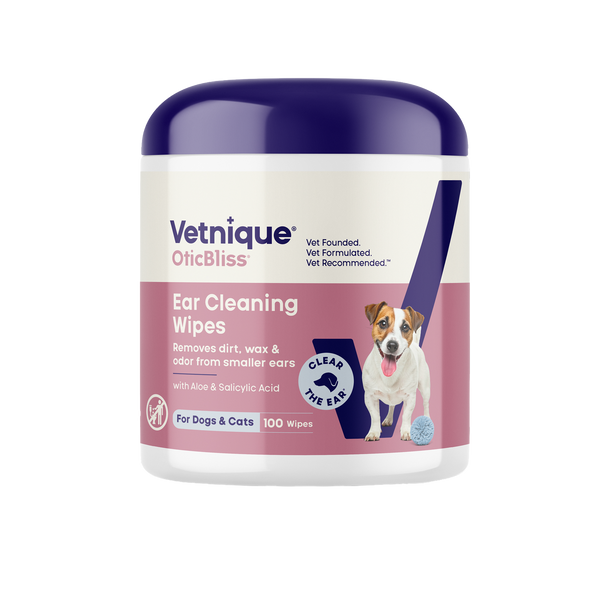 OticBliss™ Cleaning Wipes for dogs and cats are veterinary formulated for routine ear cleaning and grooming around delicate ears! Our unique medicated dog ear wipe formula is gentle on ears yet strong enough for effective cleansing, drying, and odor control. Each ear cleaning wipe for dogs and cats contains Chloroxylenol for odor control, Salicylic Acid for drying, Docusate Sodium for the softening of ear wax, soothing Aloe Vera Leaf Juice, and nourishing Vitamin E for ear skin hydration. Perfect for regular ear care, grooming, and to effectively clear the ear!™