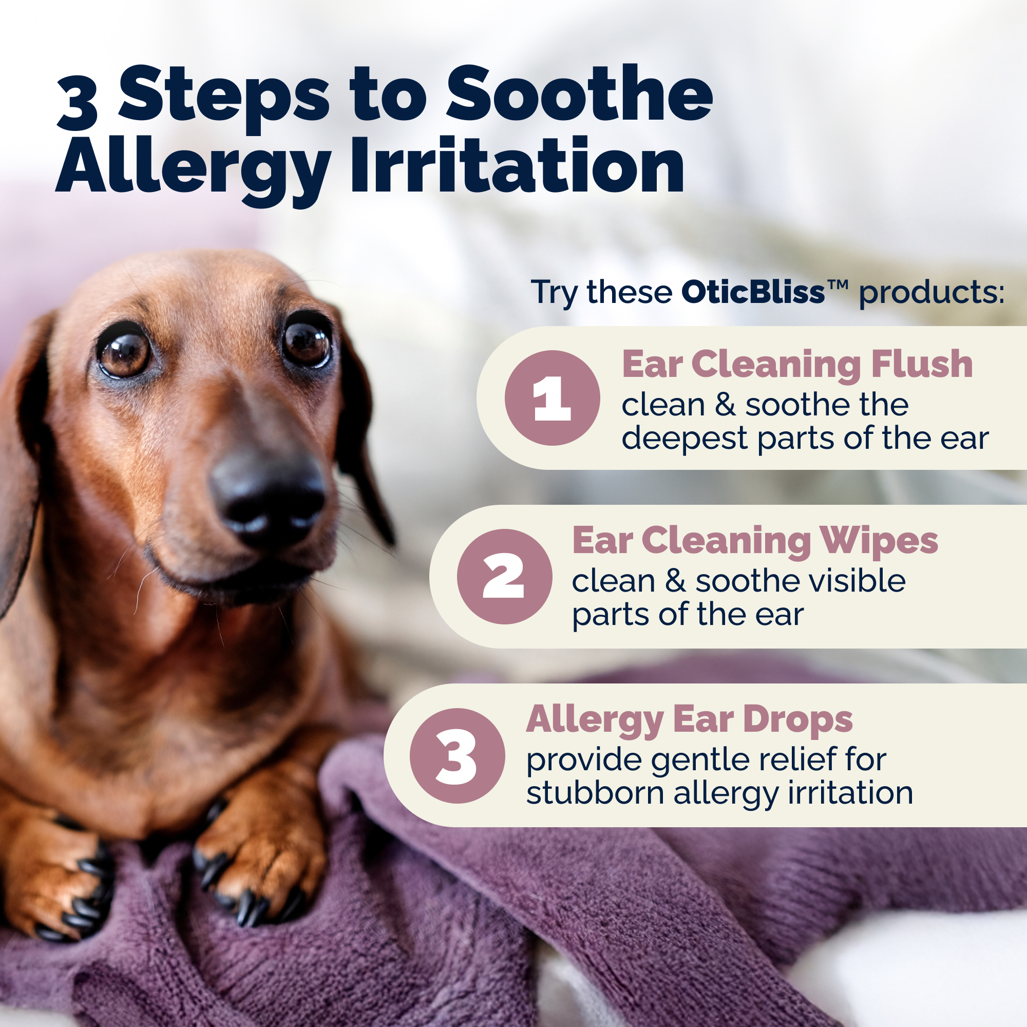 Oticbliss™ Medicated Ear Drops for dogs and cats are veterinarian formulated to help your pet find relief from painful ear irritation caused by seasonal allergies, while gently clearing wax buildup and discharge from inside the ear. Our medicated dog ear drops use 1% Hydrocortisone to help soothe ear itching, redness, and swelling caused by inflammation, with naturally-derived Chitosan to gently moisturize and support your pet’s delicate ear tissue. Oticbliss alcohol-free ear drops for dogs and cats are safe enough for daily use* when your dog’s ear is itching, and veterinarian recommended to help your pet clear the ear!™ Our dog ear drops can help to sooth ear irritation and fight again dog ear infection-like symptoms.
