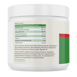 Per Chew (2.5g): Green Lipped Mussel Powder (containing Chondroitin) 220mg, Glucosamine HCl 250mg, Vitamin E 5mg, Ascorbic Acid (Vitamin C) 15mg, N-Acetyl D-glucosamine 25mg, Manganese Sulfate Monohydrate 3mg, Hyaluronic Acid 2.5mg, Omega-3 (Fish Powder) 125mg
