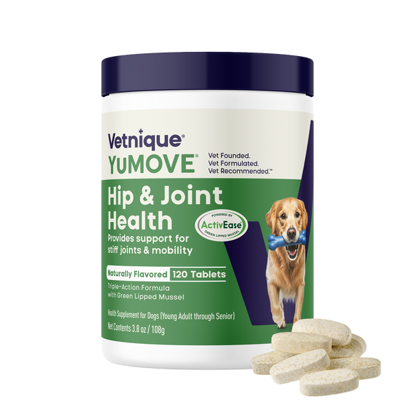 YuMOVE’s triple-action formula eases occasional joint stiffness, supports joint structure, and promotes mobility.