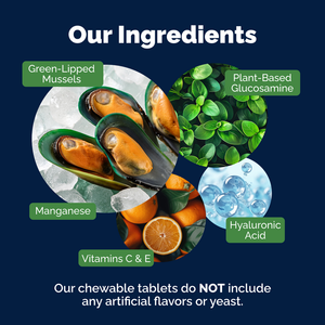 Per tablet (0.85g): Green Lipped Mussel (containing Chondroitin) 180mg, Glucosamine HCl (corn starch) 125mg, D-Alpha Tocopherol (Vitamin E) 25mg, Fish oil powder 20mg, Ascorbic Acid (Vitamin C) 15mg, N-Acetyl D-glucosamine 12.5mg, Manganese Sulfate 3mg, Hyaluronic Acid 1.5mg, Omega-3 (Fish Powder) 1mg