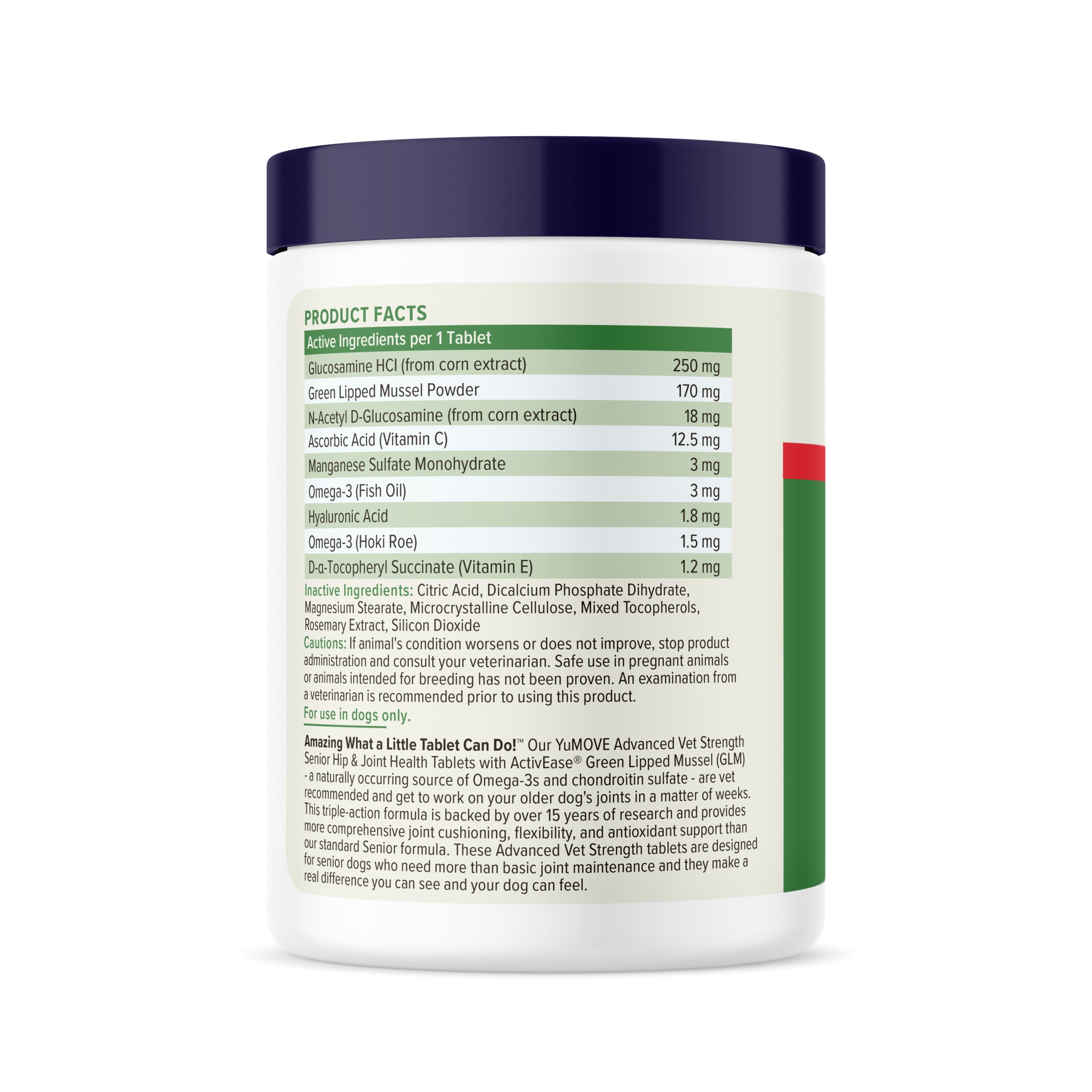 YuMOVE Senior Hip & Joint Health Tablets is a scientifically proven tablet that supports mobility, eases occasional stiffness, and promotes joint health in just 6 weeks.* Its triple-action formula combines Hyaluronic Acid to lubricate and cushion joints, plant-based Glucosamine to maintain cartilage structure, and Green-Lipped Mussel (GLM) as a natural source of Chondroitin for joint strength and flexibility. Enhanced with Vitamins C & E, powerful antioxidants that combat free radicals, YuMOVE helps aging dogs stay active, comfortable, and mobile. Give your senior dog the support they need to keep moving with ease.